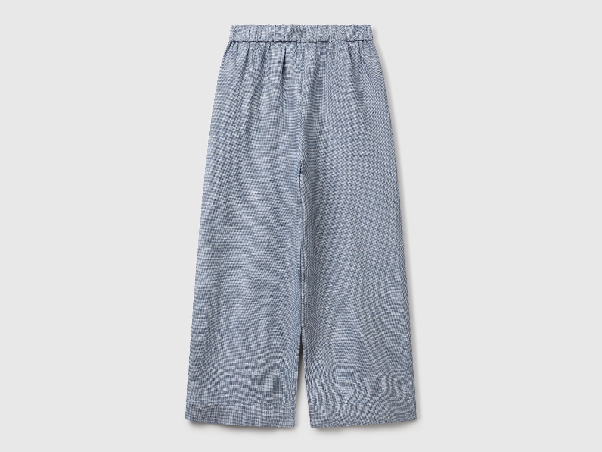 Pantaloni lunghi in tessuto leggero di misto cotone e lino a quadri tinto filo. Gamba ampia con vita elasticizzata e tasche davanti. Per outfit moderni e decisi.