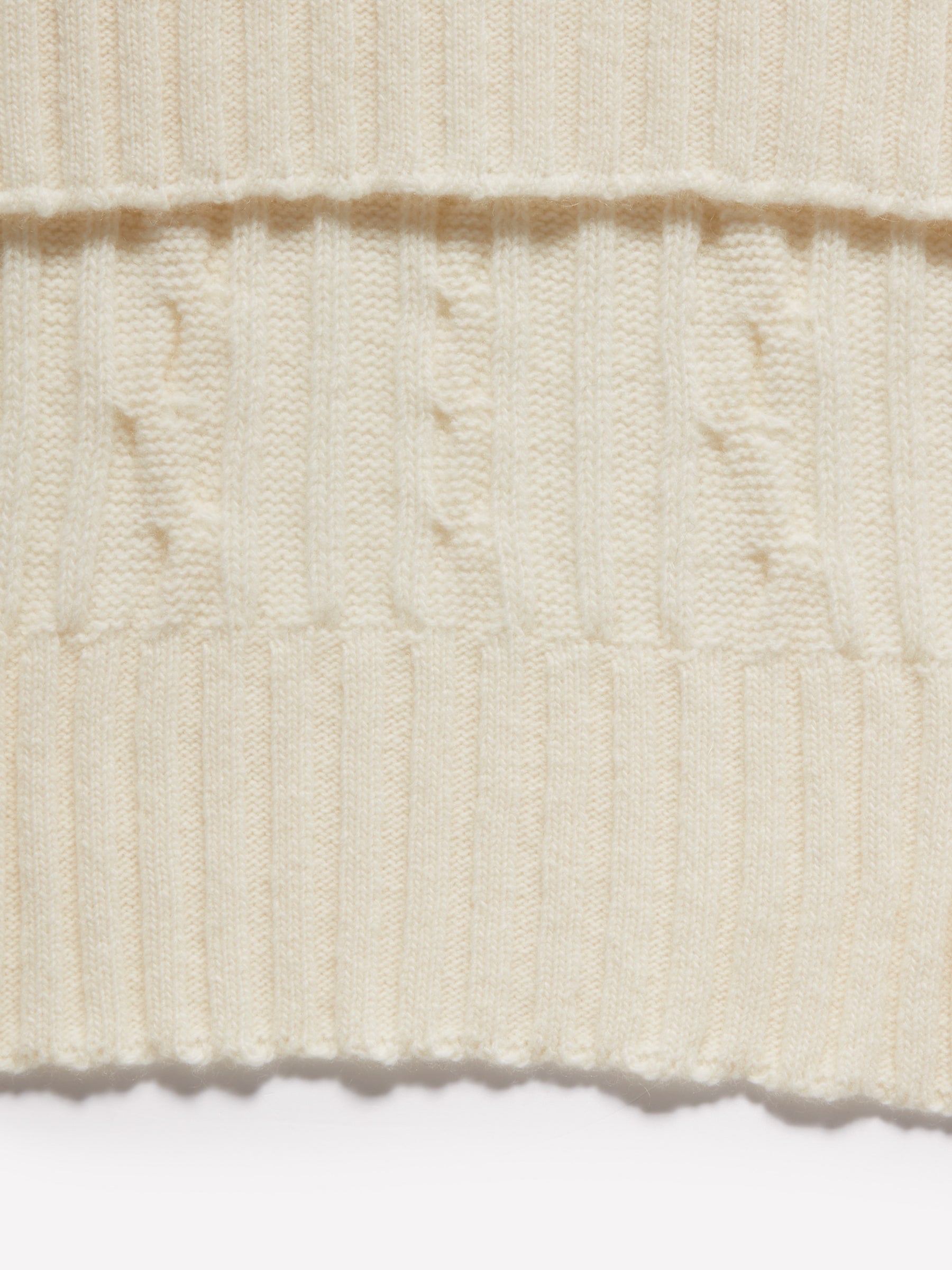Sciarpa beige in morbida maglia di misto lana, con lavorazione a trecce alternate e bordi a coste Questo capo è stato lavorato in uno stabilimento in Croazia che riutilizza circa il 60% delle acque di scarico, riducendo il consumo di acqua usata nel processo di tintura. Per info: https://wasatex.eu