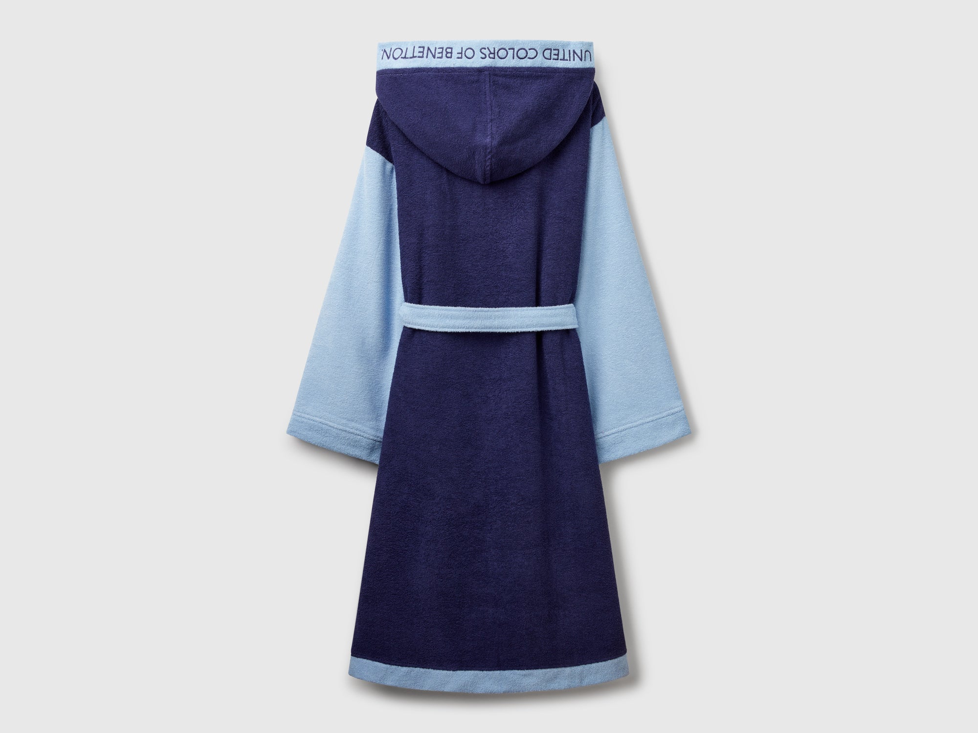Accappatoio in morbido tessuto di puro cotone biologico dal design color block. Dotato di cappuccio, manica lunga e cintura da annodare in vita. e Articolo realizzato con tessuto contenente almeno il 95% di cotone biologico.