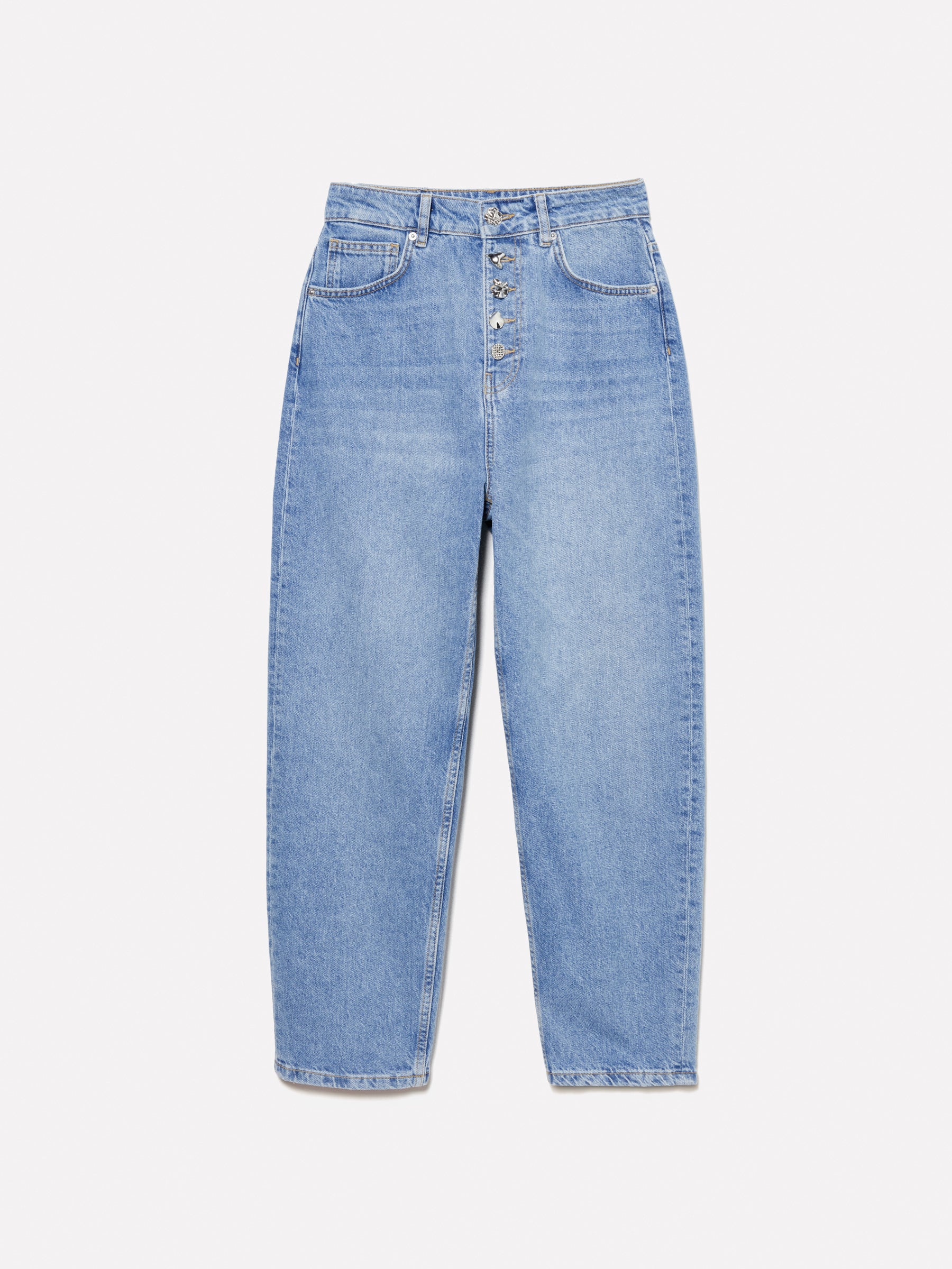 Jeans in denim 100% cotone, lavaggio leggero. Piega stirata lungo la gamba, cinque tasche e chiusura con bottoni gioiello.