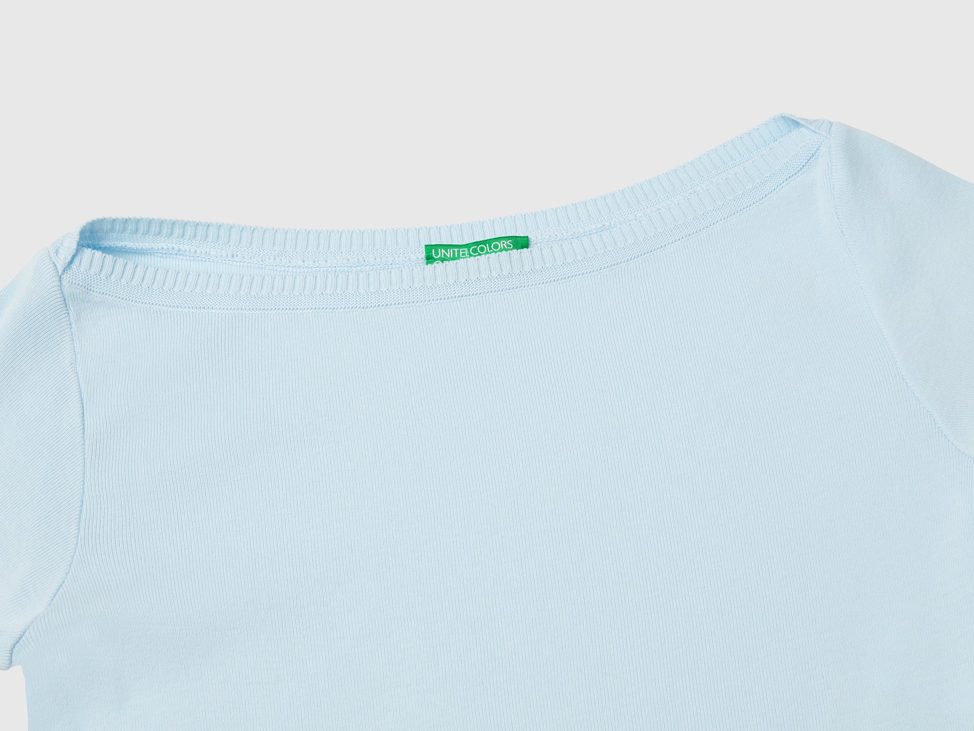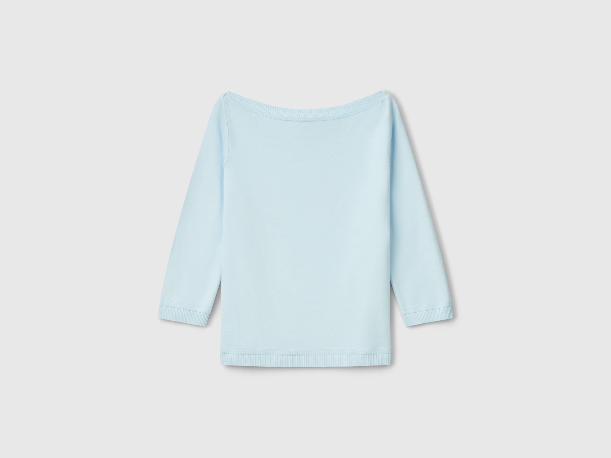 Maglione primaverile in puro cotone a costine con scollo a barchetta e manica a 3/4. Semplice, femminile e versatile.