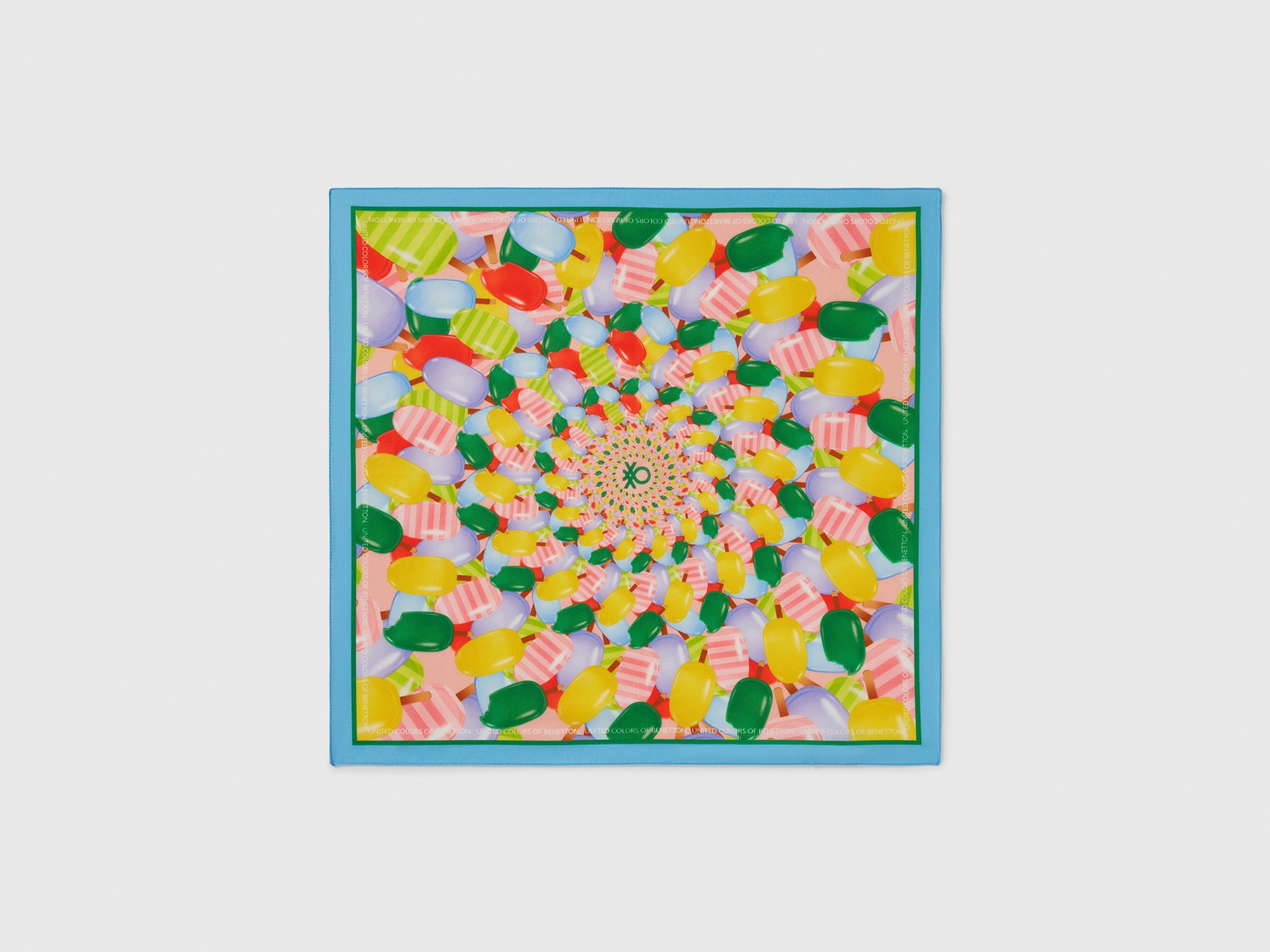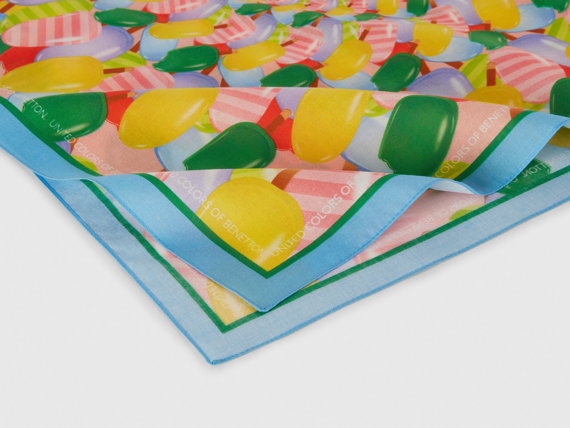 Foulard quadrato in tessuto leggero di puro cotone con bordo a righe bicolor. Pattern gelati e stampa logo al centro. Stile pop e divertente, per look pieni di personalità.