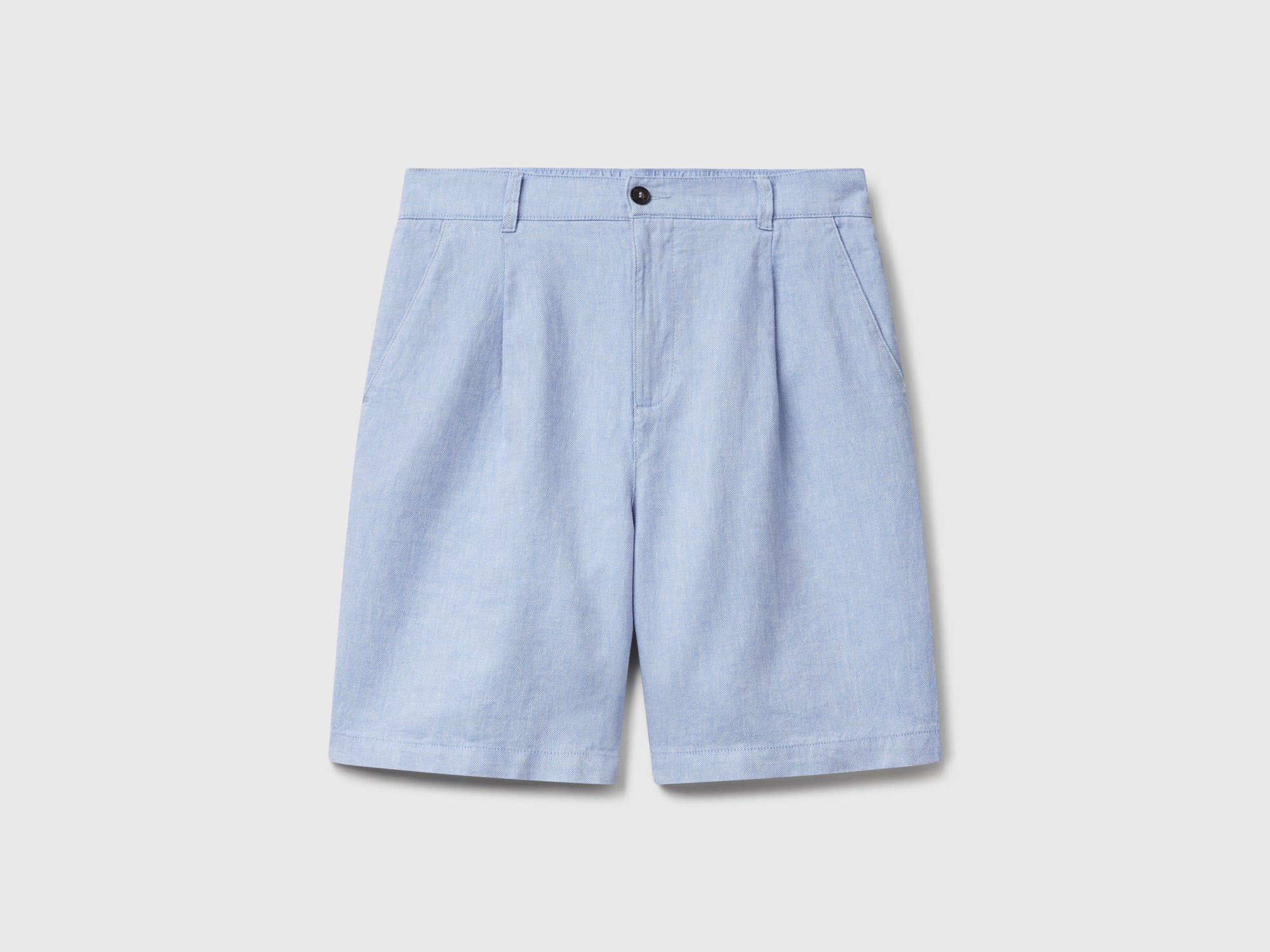 Pantaloni corti in tessuto leggero di misto cotone e lino. Pratica apertura con zip e bottone, vita con elastico interno sul retro. Tasche davanti e taschini a filetto sul retro. Fantasia a righe tinto filo su tutto il capo. Articolo realizzato con materiale contenente almeno il 50% di lino coltivato in Europa.