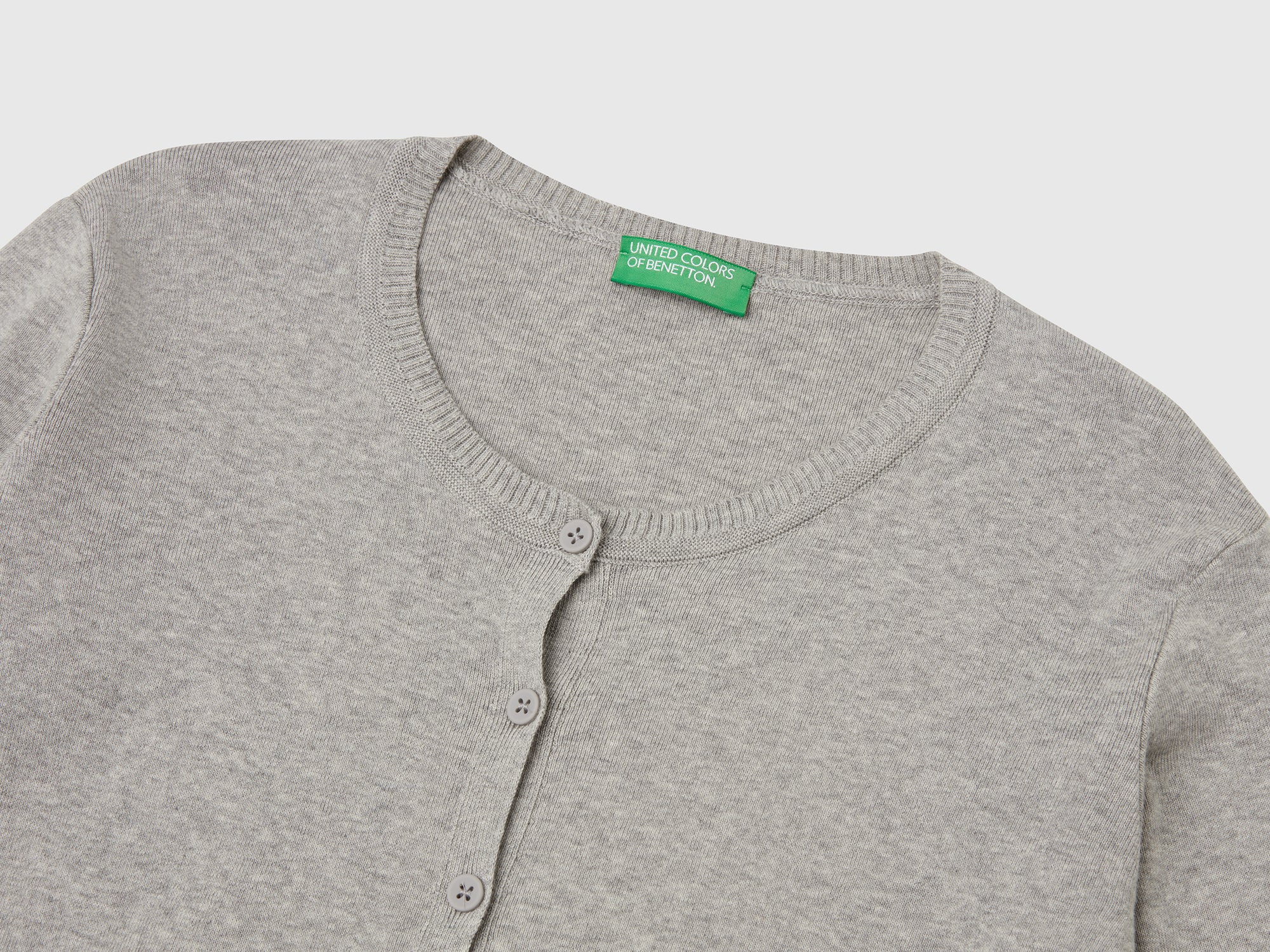 Morbida maglia girocollo a manica lunga in 100% cotone a costine con apertura frontale a bottoni. Un must-have del guardaroba femminile.