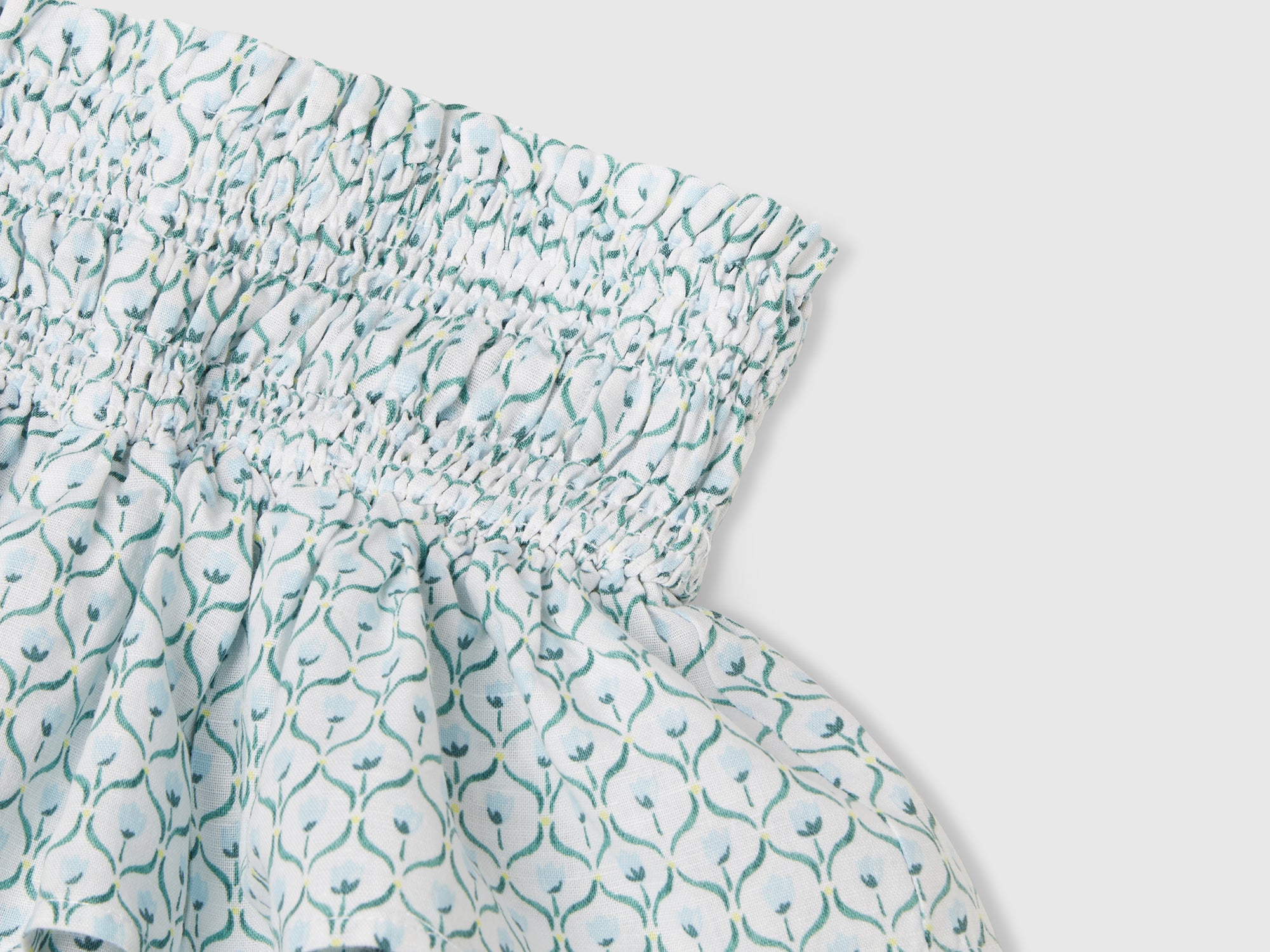 - Caratteristiche principali: Misto lino e cotone; Stampa all over; Ricamo cucito su una base di arricciature in vita