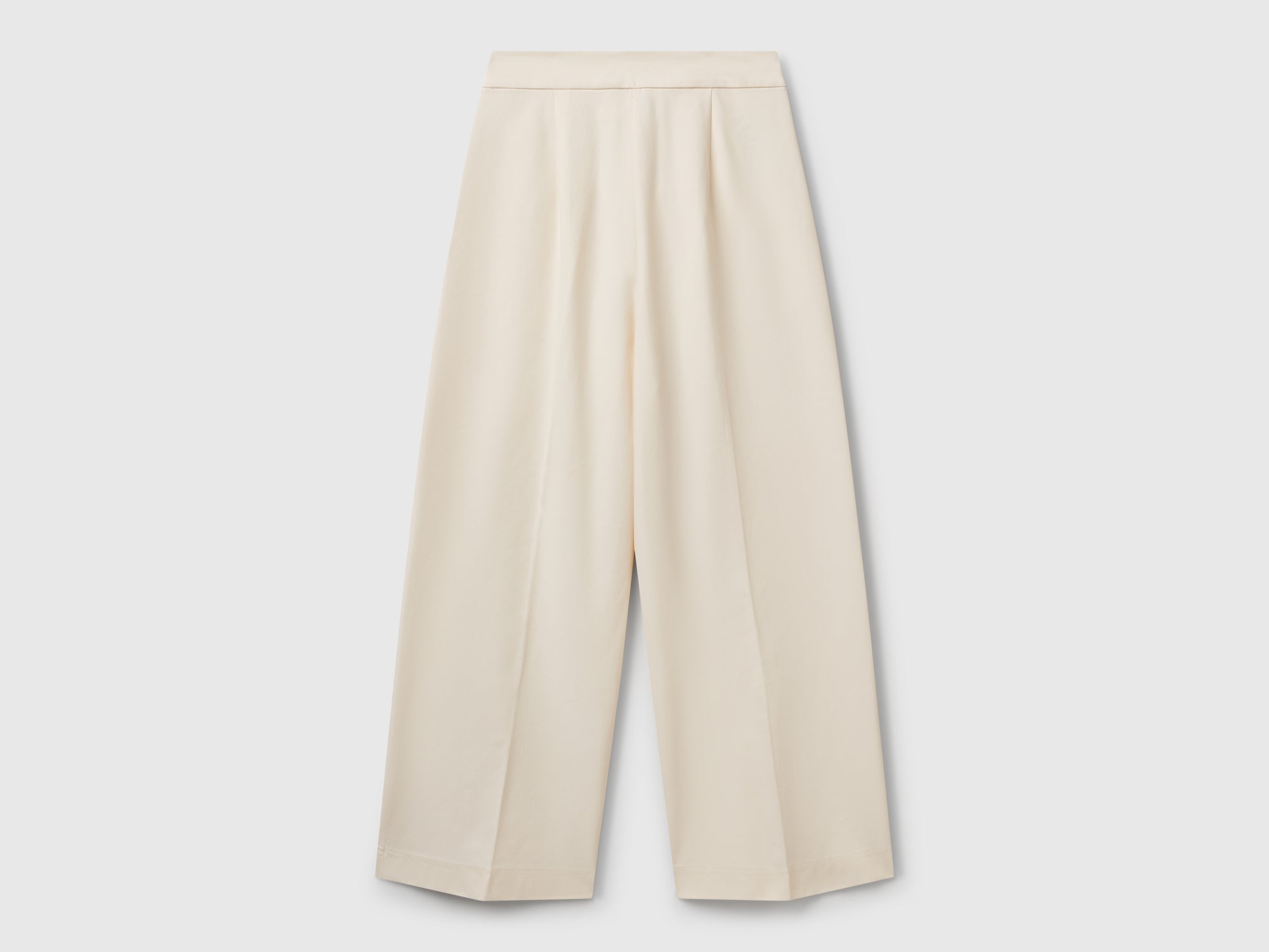 Pantaloni lunghi a vita alta in misto cotone elasticizzato. Taglio a palazzo cropped con piega centrale stirata. Apertura con zip, gancio e bottone, tasche diagonali sul davanti. Per outfit moderni e decisi.