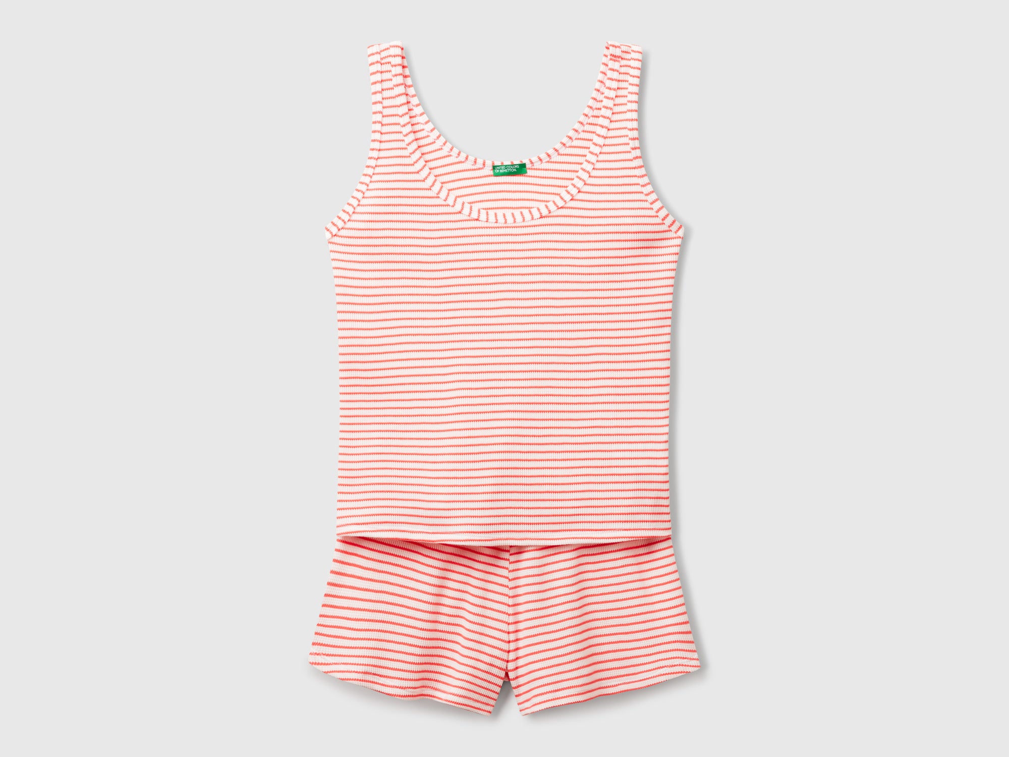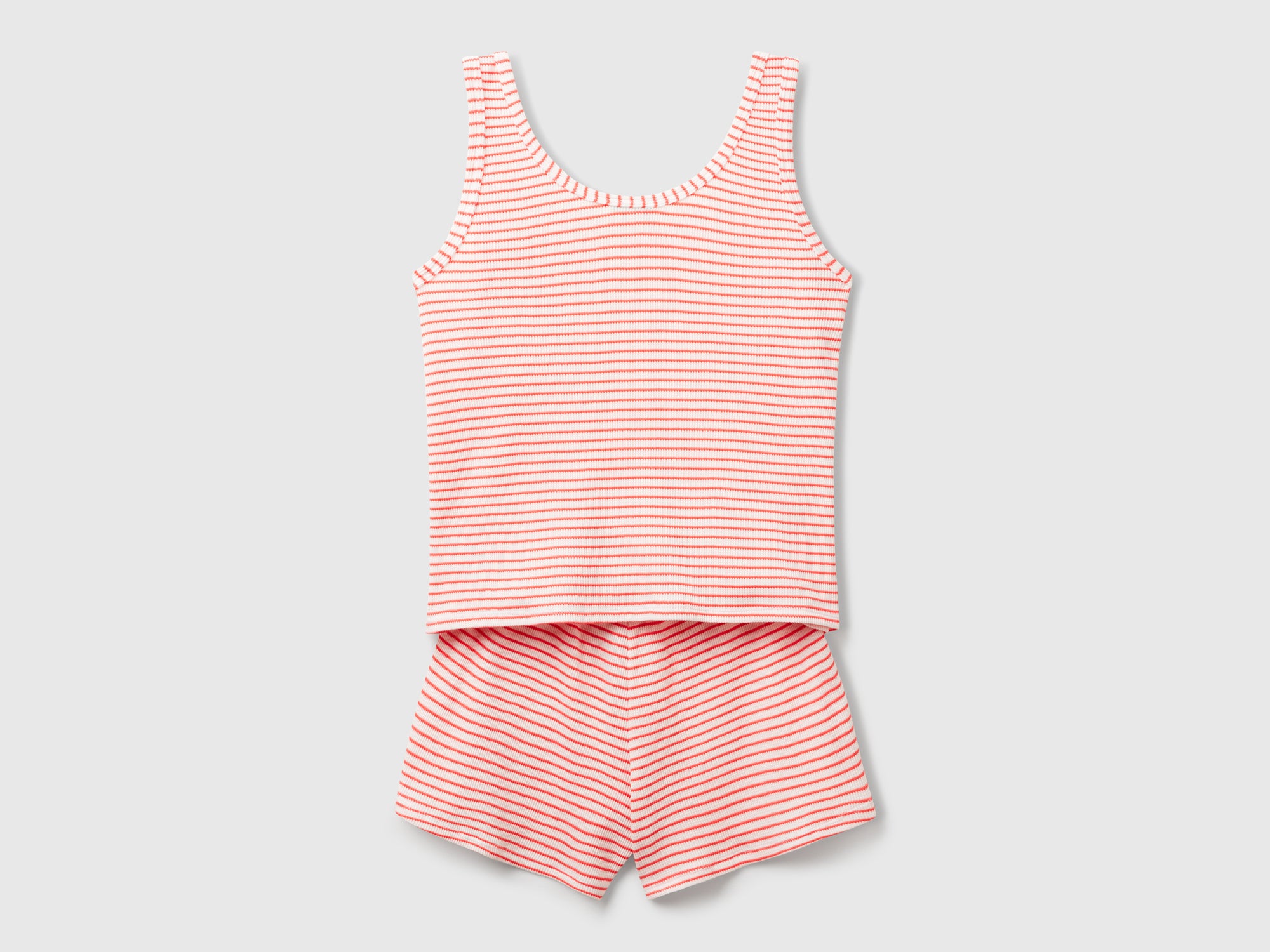 Pigiama corto in morbido tessuto di puro cotone a costine. Canotta con scollo rotondo. Pantaloni corti con elastico interno in vita. Fantasia a righe tinto filo su tutto il capo.