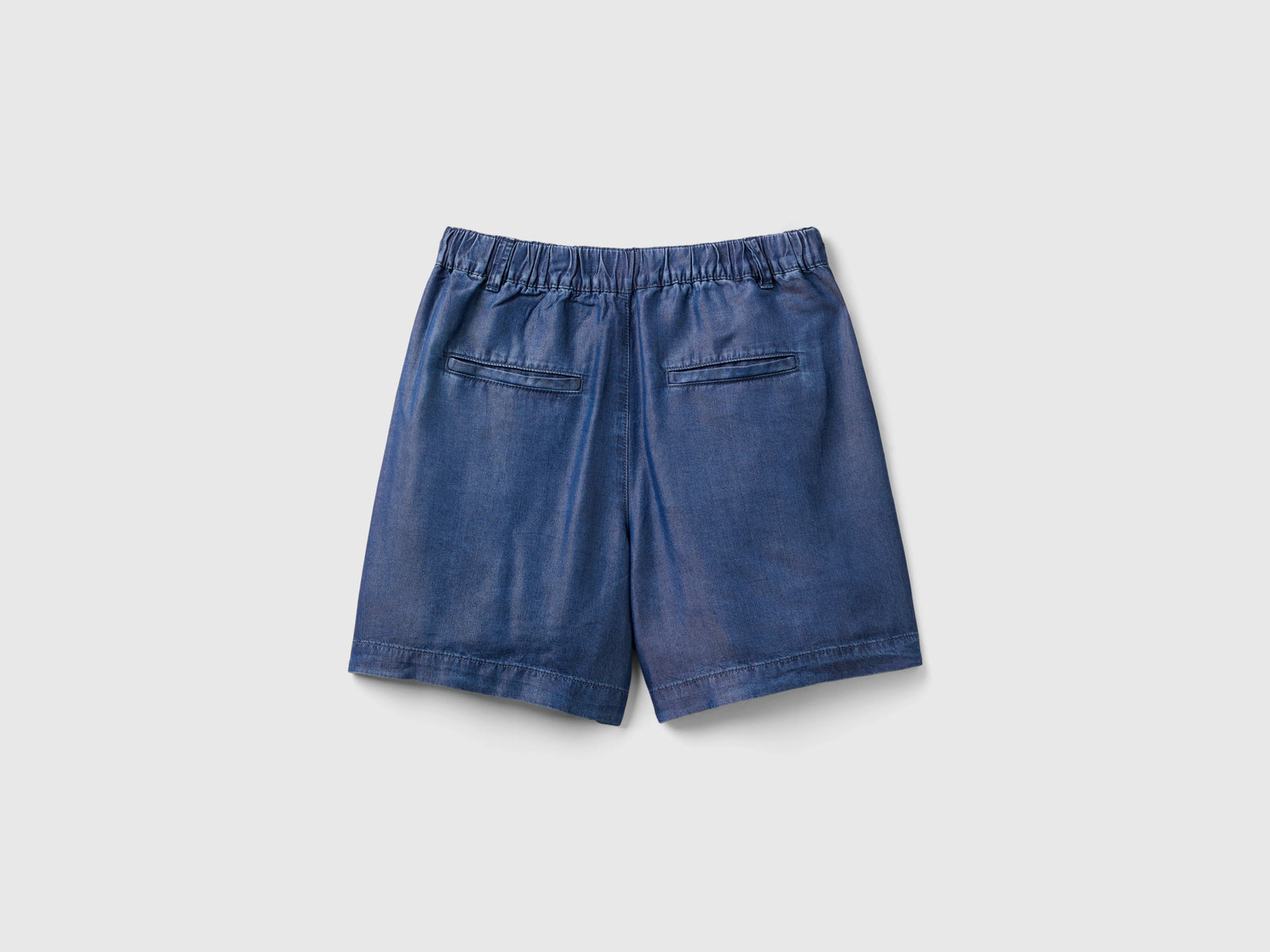 Pantaloni corti fluidi con pinces sul davanti. Vita con elastico interno sul retro, apertura a zip e bottone. Tasche frontali e taschini a filetto sul retro. Realizzati in denim Tencel™ di viscosa, prodotta utilizzando legno proveniente da foreste certificate e rispettando i più elevati standard ambientali. Articolo realizzato con materiale contenente almeno il 90% di viscosa proveniente da foreste gestite responsabilmente.
